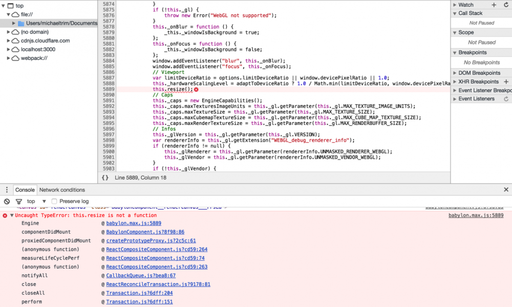 michaeltrim Posted November 16, 2016 Share Posted November 16, 2016 Hi, Can anyone recommended a method for integrating Babylon into a an electron app, built with Webpack, using React/Redux? When I import Babylon either as an inline script in head or as an ES6 import, I get the same error which i assume is connected to Electron. I've attached an image of the top of the stack trace and the line in babylon that errors is the this.resize(); as per below; var limitDeviceRatio=options.limitDeviceRatio||window.devicePixelRatio||1.0;this._hardwareScalingLevel=adaptToDeviceRatio?1.0/Math.min(limitDeviceRatio,window.devicePixelRatio||1.0):1.0;this.resize();// Any ideas greatly appreciated. Michael Quote Link to comment Share on other sites More sharing options...
