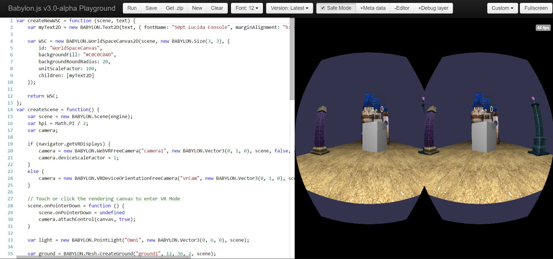 davrous Posted April 14, 2017 Author Share Posted April 14, 2017 Hello, Here is small samples I've created: http://www.babylonjs-playground.com/#6PVF0Y#2 & http://www.babylonjs-playground.com/#6PVF0Y#5 that shows how to: - Use WebVRCamera with a fallback to DeviceOrientation camera for Cardboard/mobile support - Use Canvas2D in World Space mode to integrate some 2D UI in VR Should be a good starting point for people who'd like to experiment Jaskar 1 Quote Link to comment Share on other sites More sharing options...
