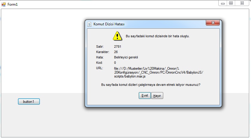 Ahmet Gürbüz Posted July 24, 2017 Share Posted July 24, 2017 Hi Everyone. I have winform application C# .Net. I tried to use webbrowser to display BABYLONJS, but I have have some problems. Is it possible to display it on webbrowser? Unfourtunately, photos are not turkish, but it says "Belirleyici gerekli" means needs definer" '"BABYLON' tanımız" means "BABYLON is undefined". on webbrowser side: private void button1_Click(object sender, EventArgs e) { string curDir = Directory.GetCurrentDirectory(); webBrowser1.Url = new Uri("file:///D:/Musteriler/Liv%20Makina/_Omron%20Konfigürasyon/_CNC_Omron/PC/OmronCncV4/BabylonJS/index.html"); webBrowser1.ScriptErrorsSuppressed = true; } thank you. Ahmet. Quote Link to comment Share on other sites More sharing options...