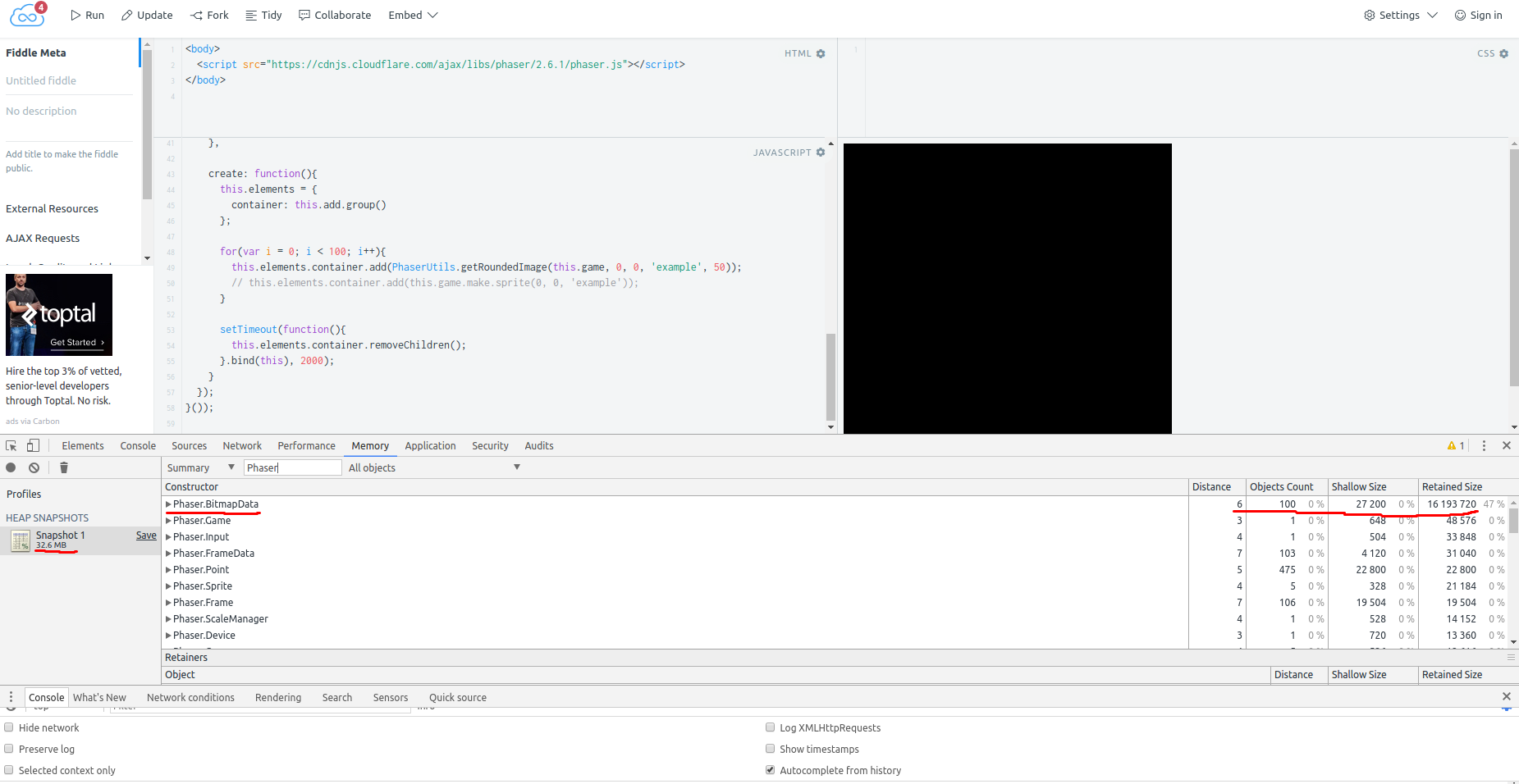samme Posted August 30, 2017 Share Posted August 30, 2017 I think you should use Group#removeAll(true) instead of removeChildren(). I think BitmapDatas also have to be destroyed manually: https://jsfiddle.net/3ndreou5/1/ quiphop and luq 2 Link to comment Share on other sites More sharing options...