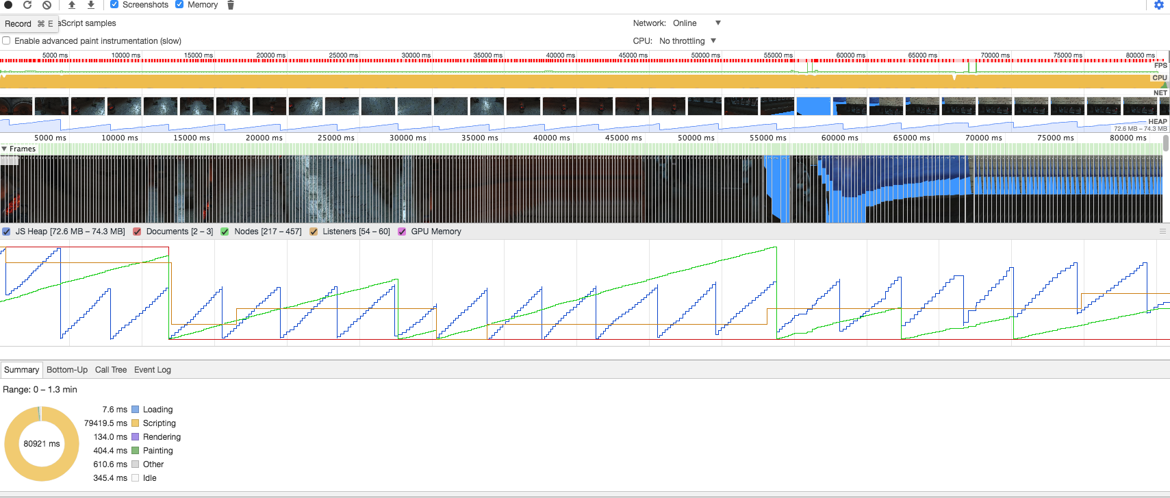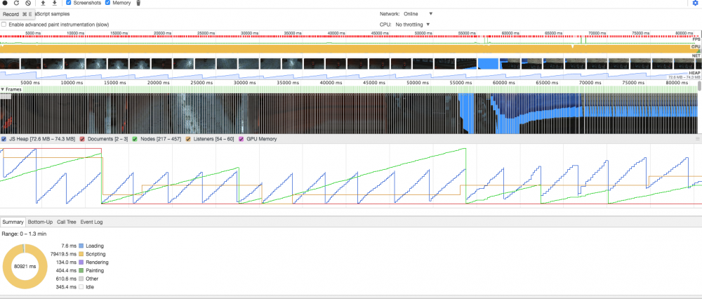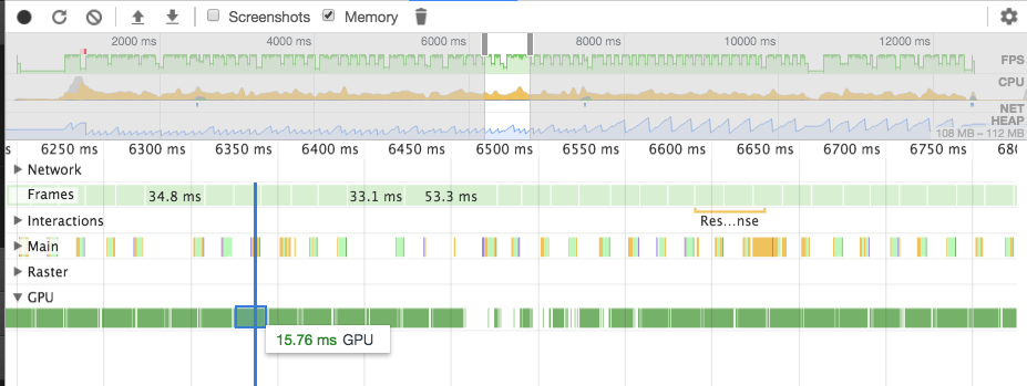 thrice Posted December 18, 2017 Author Share Posted December 18, 2017 18 minutes ago, Deltakosh said: Can you share screenshots? Of the profile output? Sure but I'm no expert at interpreting the output, and not entirely sure what normal looks like. Here are some shots of what appears to be relevant. One thing that does seem curious is on the line graph, there does not appear to be a line for GPU memory as far as I can tell. Also the warning on the animation frame fired / recurring handler. -- it does seem consistent with the behavior I am seeing in my electron app (mostly doing nothing, and fps is < 60, well in this case < 10 fps). Also worth noting that when I had my app upgraded to the newest version, I ran it on my laptop (new macbook pro), to make sure it wasn't a computer thing/setting. Performance was consistent with my current computer (2015 iMac). -- And I just ran sponza on my macbook pro also to make sure, performance is < 10 FPS there as well. Are you guys not seeing < 10 FPS ? Quote Link to comment Share on other sites More sharing options...