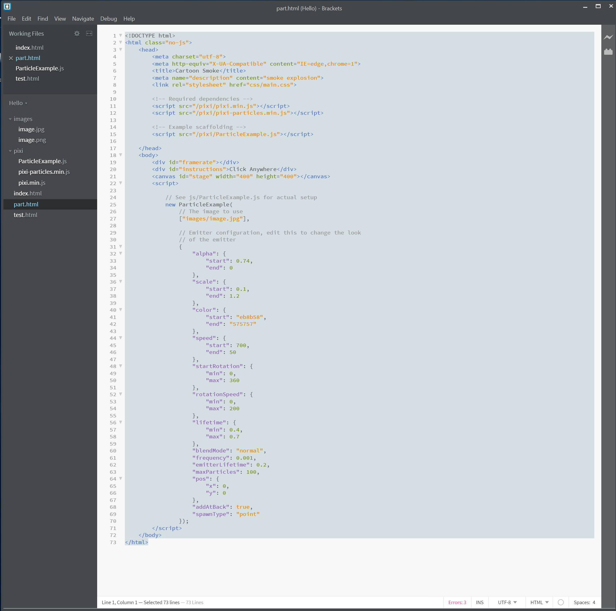 kawho Posted July 16, 2018 Author Share Posted July 16, 2018 After couple of hours heating my head against wall, I got the Pixi working (the rotating image and canvases black square examples ). but Now I hit another snag and can not figure why this code no-work!!! can anybody please have a look and tell me what i'm doing wrong?? I'm trying to run a html file called "part.html" with below code: <!DOCTYPE html> <html class="no-js"> <head> <meta charset="utf-8"> <meta http-equiv="X-UA-Compatible" content="IE=edge,chrome=1"> <title>Cartoon Smoke</title> <meta name="description" content="smoke explosion"> <link rel="stylesheet" href="css/main.css"> <!-- Required dependencies --> <script src="/pixi/pixi.min.js"></script> <script src="/pixi/pixi-particles.min.js"></script> <!-- Example scaffolding --> <script src="/pixi/ParticleExample.js"></script> </head> <body> <div id="framerate"></div> <div id="instructions">Click Anywhere</div> <canvas id="stage" width="400" height="400"></canvas> <script> // See js/ParticleExample.js for actual setup new ParticleExample( // The image to use ["images/image.jpg"], // Emitter configuration, edit this to change the look // of the emitter { "alpha": { "start": 0.74, "end": 0 }, "scale": { "start": 0.1, "end": 1.2 }, "color": { "start": "eb8b58", "end": "575757" }, "speed": { "start": 700, "end": 50 }, "startRotation": { "min": 0, "max": 360 }, "rotationSpeed": { "min": 0, "max": 200 }, "lifetime": { "min": 0.4, "max": 0.7 }, "blendMode": "normal", "frequency": 0.001, "emitterLifetime": 0.2, "maxParticles": 100, "pos": { "x": 0, "y": 0 }, "addAtBack": true, "spawnType": "point" }); </script> </body> </html> the pixi.min.js , pixi-particles.min.js and ParticleExample.js downloaded from GitHub. Quote Link to comment Share on other sites More sharing options...