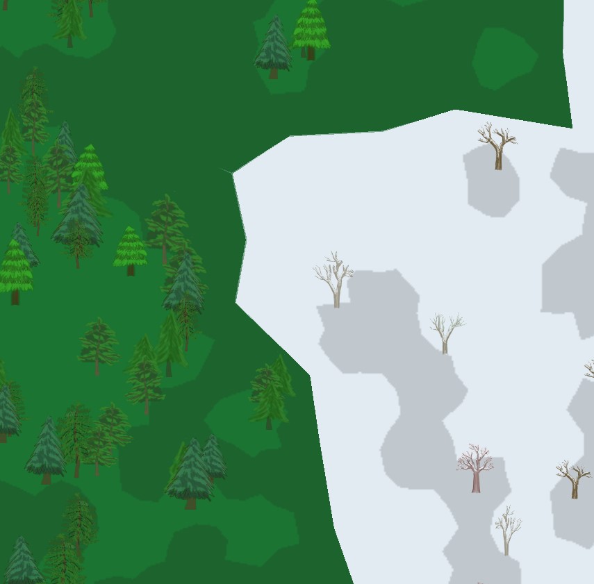 lancety Posted August 31, 2021 Share Posted August 31, 2021 In my top-down view game, the terrain is formated with many polygon regions. each region has a different biome type. such as the below screenshot, one is a forest, another one has snow. It does not look good with a clear edge between the 2 regions. I want to make the edge colour blended, so the colour is smoothly transferred. appreciate any help, cheers. Quote Link to comment Share on other sites More sharing options...