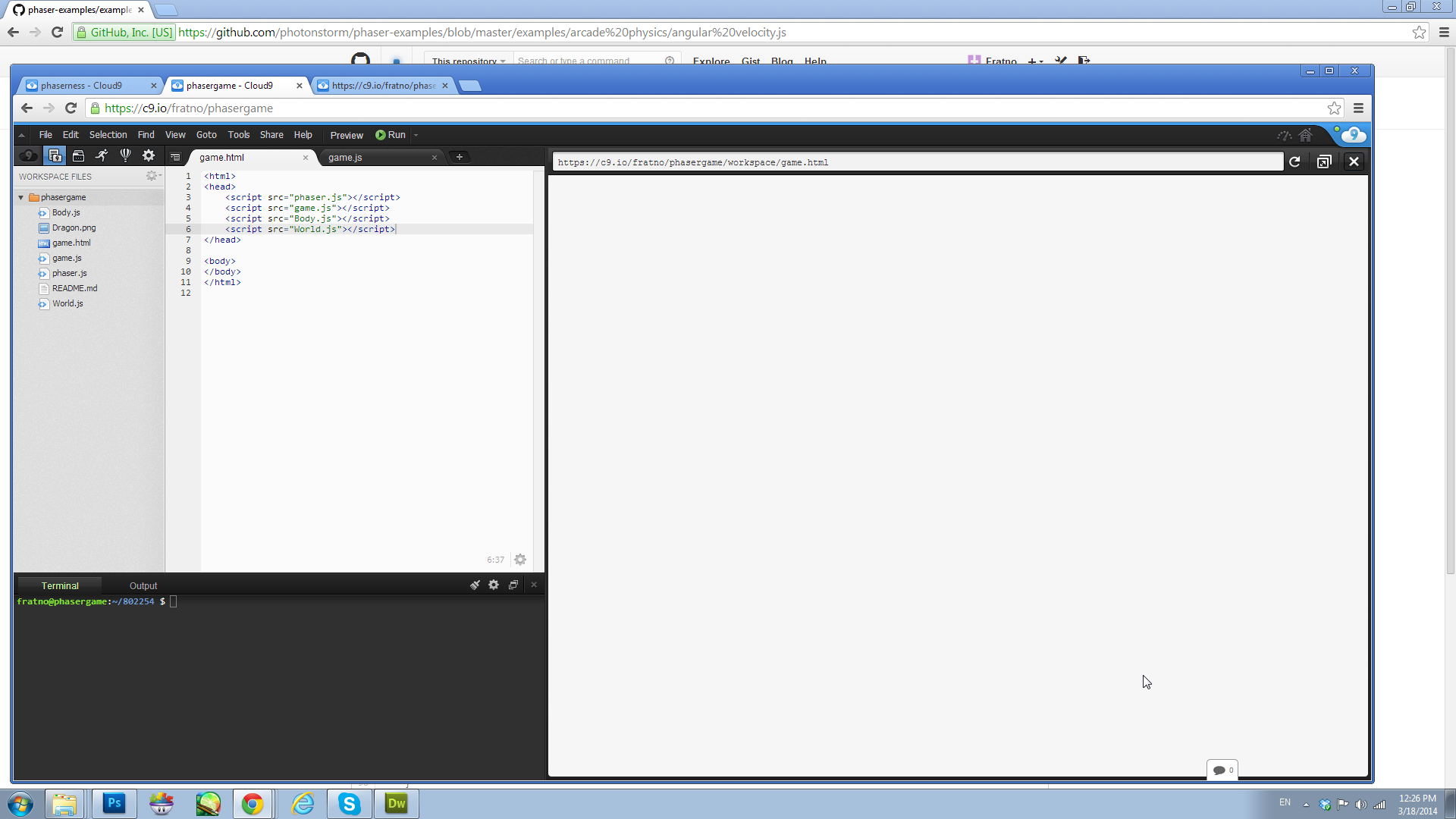 Froton X Posted March 18, 2014 Share Posted March 18, 2014 Hey, I'm working on the cloud9 ide, and in the preview, the sprite remains static, it is not falling and the controls set are not controlling it either. I've attached a screenshot and pasted the code. var dragonSprite;var game = new Phaser.Game (800, 600, Phaser.AUTO, '',{ preload: preload, create: create, update: update });function preload() {game.load.image('dragon', 'Dragon.png');}function create() {dragonSprite = game.add.sprite(game.world.centerX,500, 'dragon');dragonSprite.acceleration.y = 100; // gravitydragonSprite.body.collideWorldBounds = true;dragonSprite.body.drag.x = 0;dragonSprite.anchor.setTo('.5, .5');}function update() {if (game.input.keyboard.isDown(Phaser.Keyboard.LEFT)) {dragonSprite.velocity.x = -125;dragonSprite.scale.x = 1;} else if (game.input.keyboard.isDown(Phaser.Keyboard.RIGHT)) {dragonSprite.velocity.x = 125;dragonSprite.scale.x = -1;}}if(game.input.keyboard.isDown(Phaser.Keyboard.UP)) {dragonSprite.velocity.y = -100;}Anything wrong with the code? I changed the y position of the character later from 0 to 500 so now they are near the bottom without touching any border and it still won't move. Am I doing something wrong? Did I pick a bad time to start learning since I'm seeing the 2.0 is out and all. O -0 Link to comment Share on other sites More sharing options...