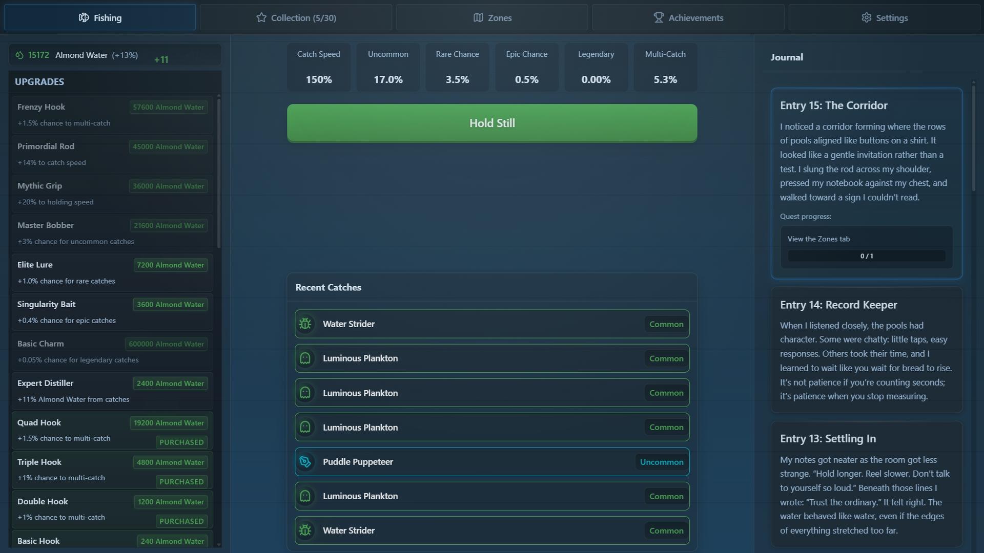liminalspacedev Posted Monday at 09:47 PM Share Posted Monday at 09:47 PM (edited) Hey everyone, Here’s my latest project: Backrooms Fishing, a liminal horror idle/fishing game built for browser and PC. 🐟 About the Game You are lost in the Poolrooms. - Fish to survive - Complete quests. - Upgrade your gear. Only then you can hope to escape. 🔄 Current Demo The itch.io demo features: • Core gameplay loop • Early progression • Base UI and journal system 🚧 Roadmap • More creatures and pets • Expanded upgrade system • Prestige / ascension • More journal entries 🎮 Play & Wishlist • Play the demo: Backrooms Fishing on itch.io • Wishlist on Steam: Steam page 💬 Looking for Feedback I’d really appreciate any thoughts on: • Game feel and pacing • UI clarity • Atmosphere and sound design Thanks for checking it out; hope you enjoy fishing in the Backrooms! Edited Tuesday at 10:03 PM by liminalspacedev added prefix, added screenshots Quote Link to comment Share on other sites More sharing options...